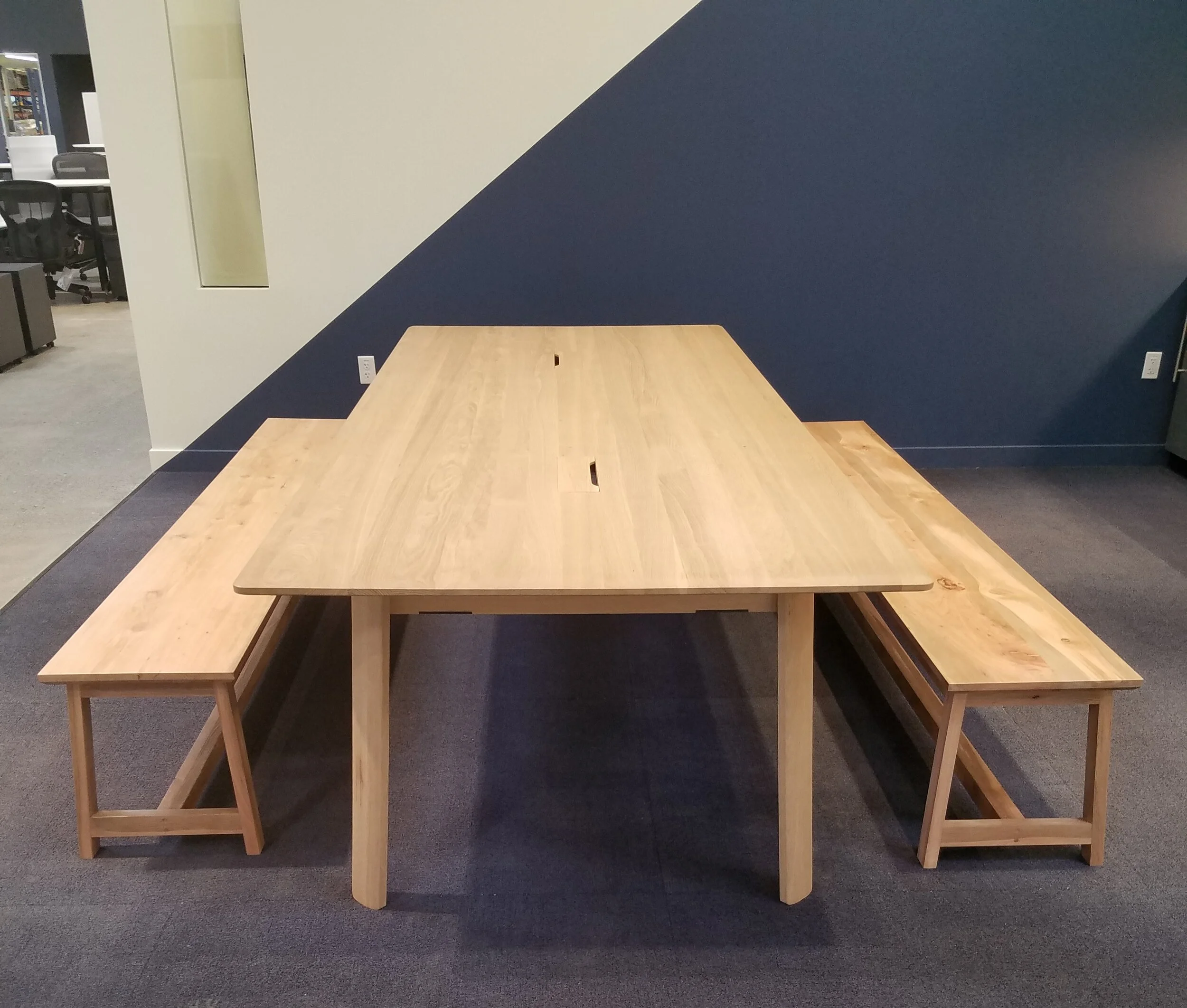 Chisel Creative designed and built benches to match a a commercially purchased white oak dining table for an office lunch room.