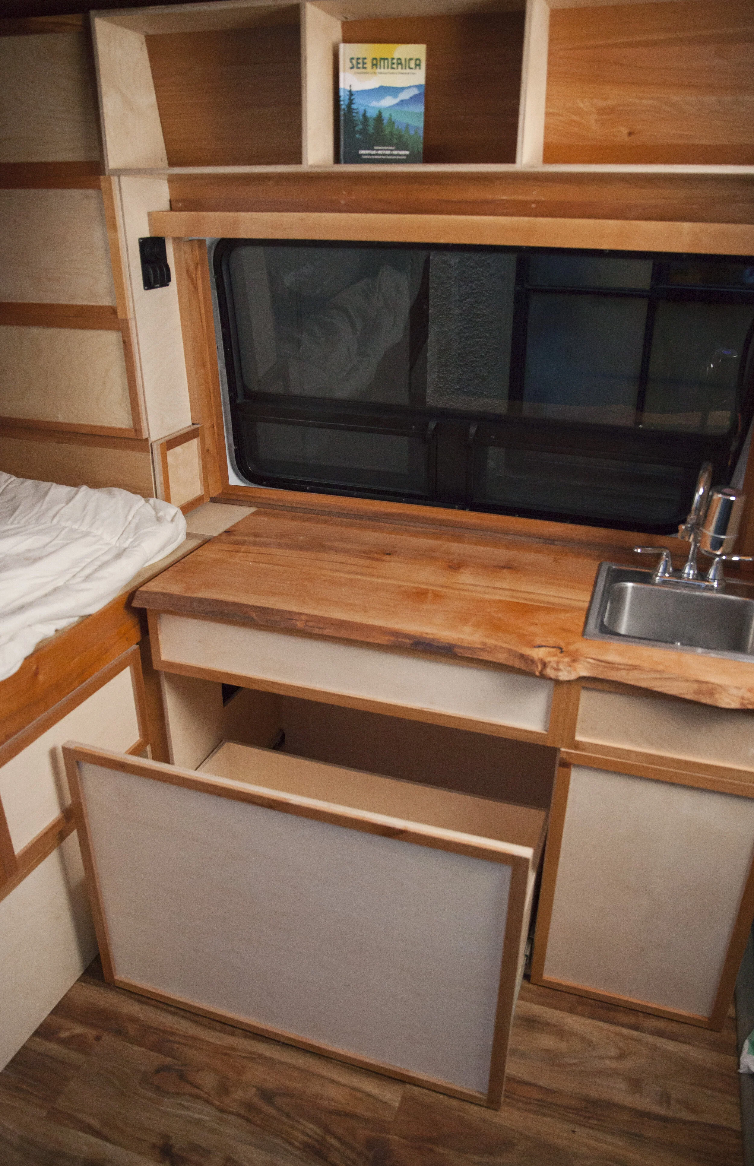 Inspired by Hygge, natural materials, and theory on Space and Place, this 90 square foot Mercedes Sprinter van is a customized home. It has a bed, kitchenette, seating, dining, and storage, with incorporated electrical and plumbing.